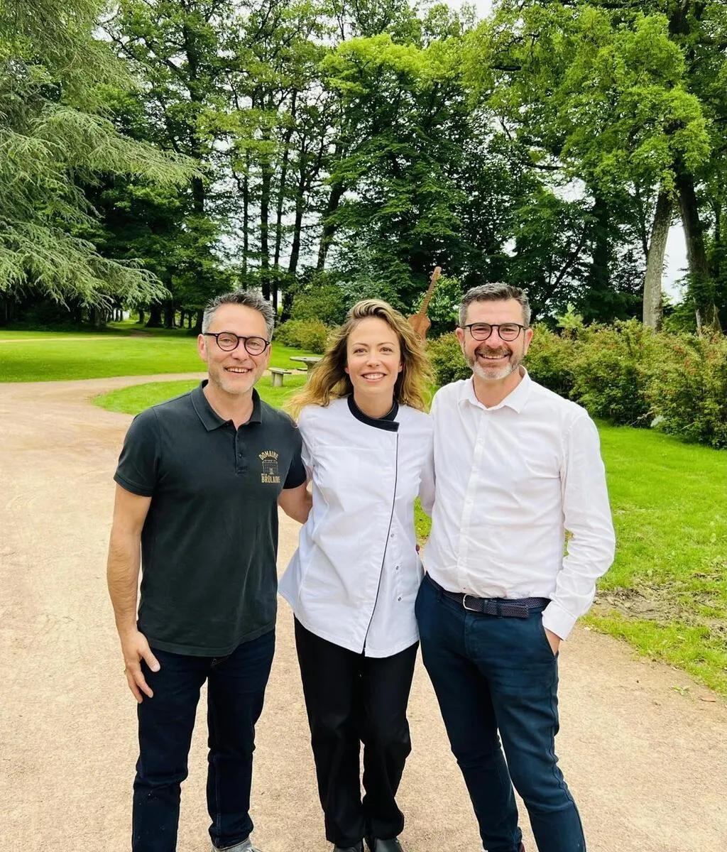 L’actrice Dounia Coesens, présente dans le premier épisode de la série « Joseph », avec les propriétaires du domaine de la Brûlaire, Vivien et Miguel Bertho-Macé. © Château de la Brûlaire