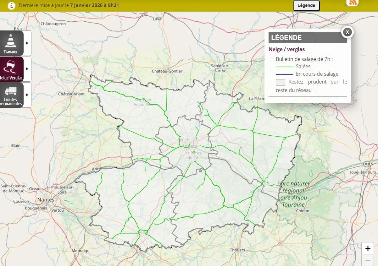 En vert, les axes salés à 9h21, ce mercredi 7 janvier 2026. Inforoutes