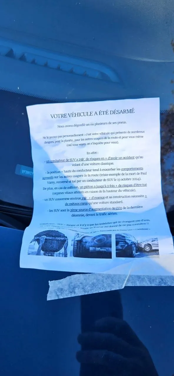 « Votre véhicule a été désarmé » : des militants anti-SUV dégonflent des pneus de voitures... |