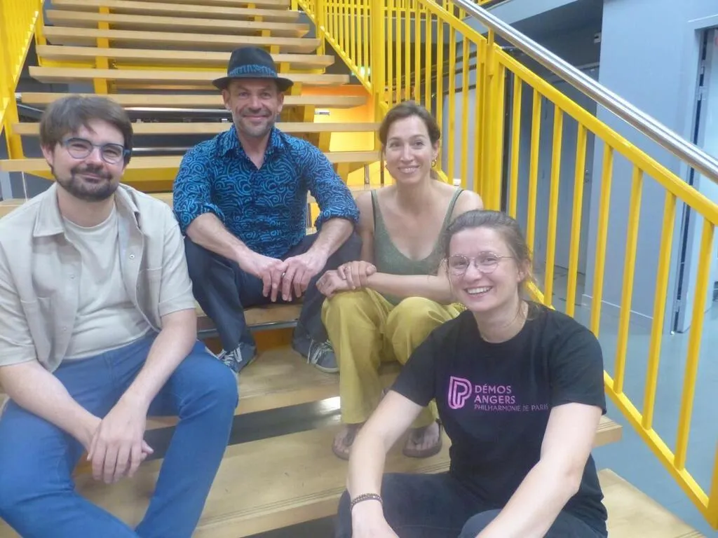 Tangy Bouvet, le chef d’orchestre de Démos, Vincent Loiseau alias Kwal le récitant, Caroline Desmaison pour la danse et Hélène de Law de Lauriston pour la musique, intervenantes Démos. © Ouest-France