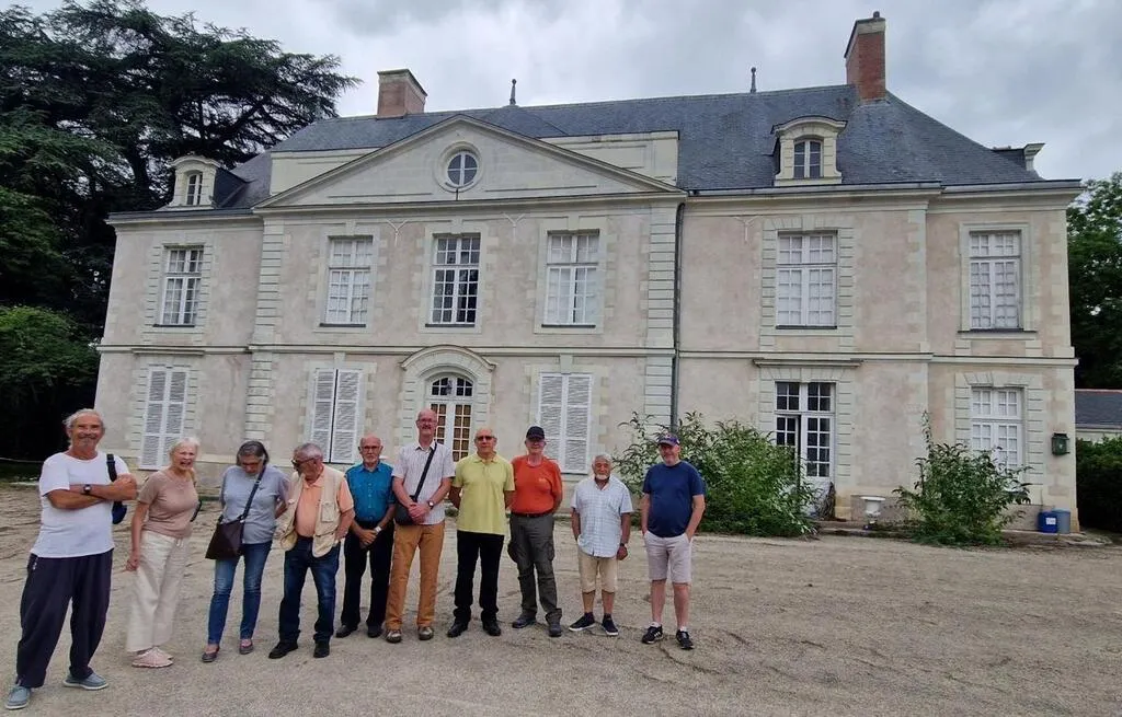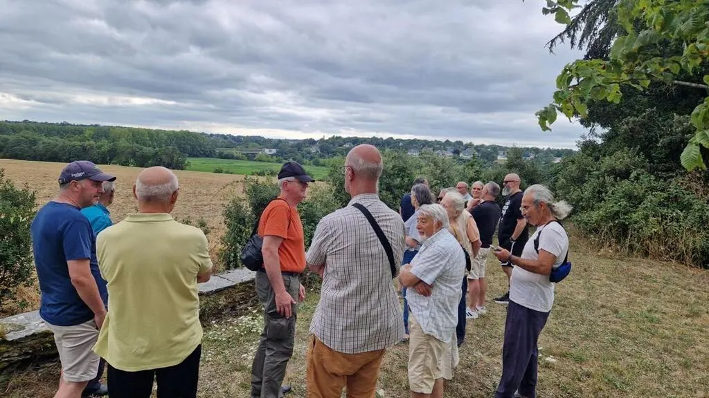 Saint-Jean-de-Linières, le 3 août 2024. Une vingtaine de personnes ont suivi début août le circuit de la Libération animé par l’historien Guy Stefanini (à droite) accompagné de Michel Letertre (à droite à l’arrière-plan), professeur d’histoire, tous deux membres des Amis de Pignerolle. © CO – Régine LEMARCHAND