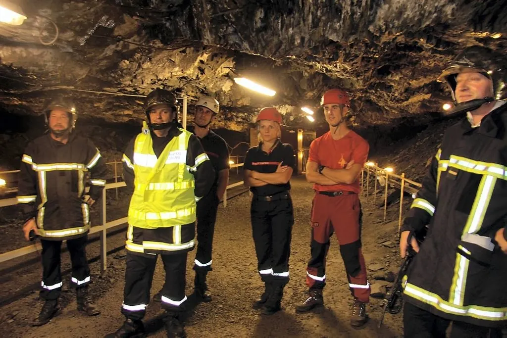 Une partie de l’équipe des pompiers de Segré et du Grimp 49, spécialisée dans les situations en milieu périlleux, dans une des galeries de la Mine Bleue, à 130 mètres sous terre.
