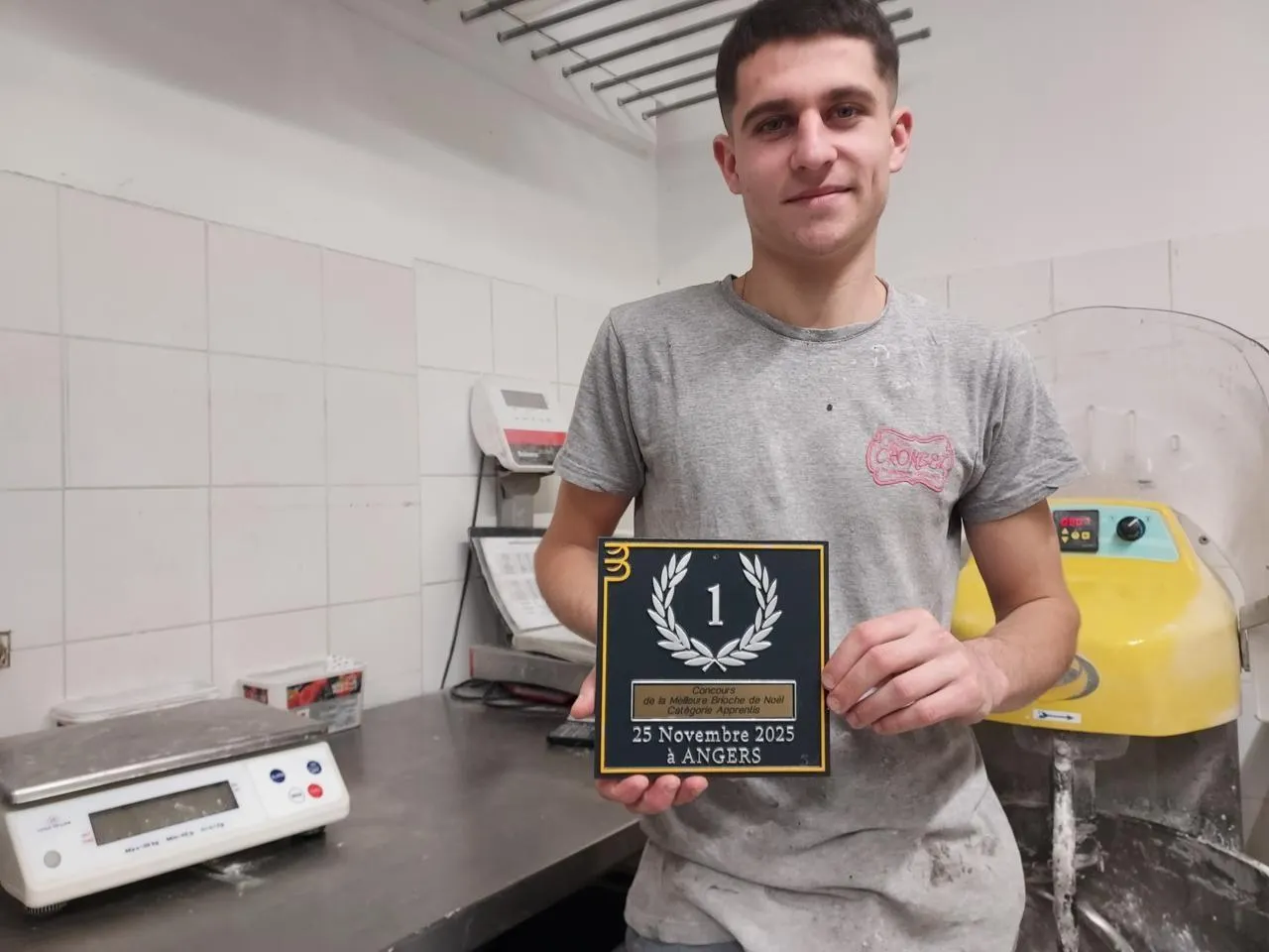 Félix Delafuys, apprenti boulanger, présente son 1er trophée de la meilleure brioche de Noël, entre la balance et le pétrin dans le fournil de la boulangerie Crombez. Ouest-France