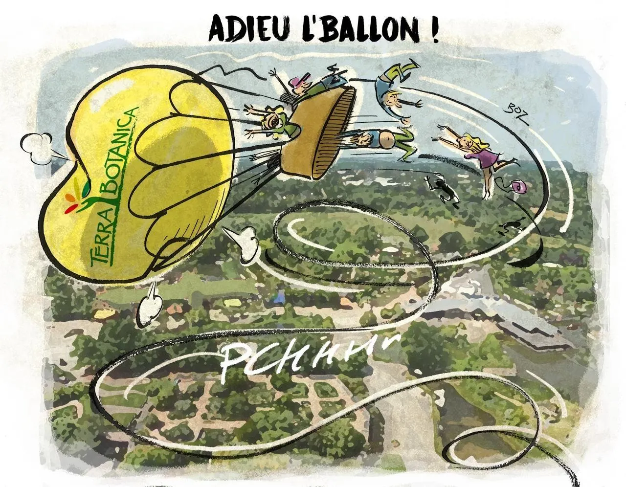 Adieu l’emblème du parc Terra Botanica. Le ballon, trop vieux, ne volera plus. Notre dessinateur, Boz, imagine le moment où il vivra ses derniers instants… © Boz