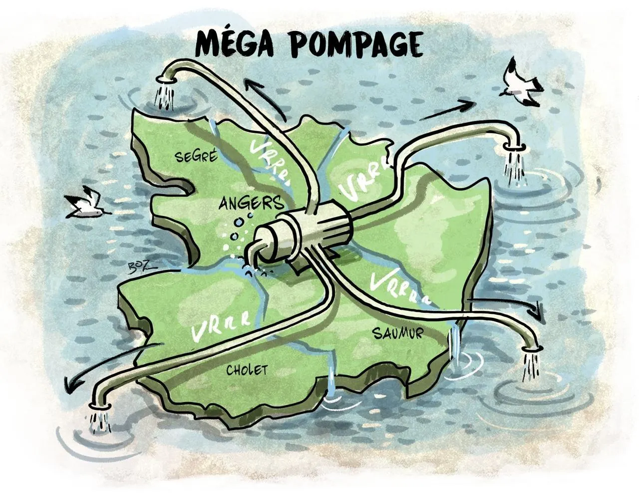 Les pompiers pompent, pompent, pompent depuis des jours pour vider des millions de m3 d’eau stockés dans les caves, parkings et sous-sols du Maine-et-Loire. Et s’ils refourguaient tout aux voisins ? C’est la théorie loufoque qui amuse notre dessinateur Boz. © Boz