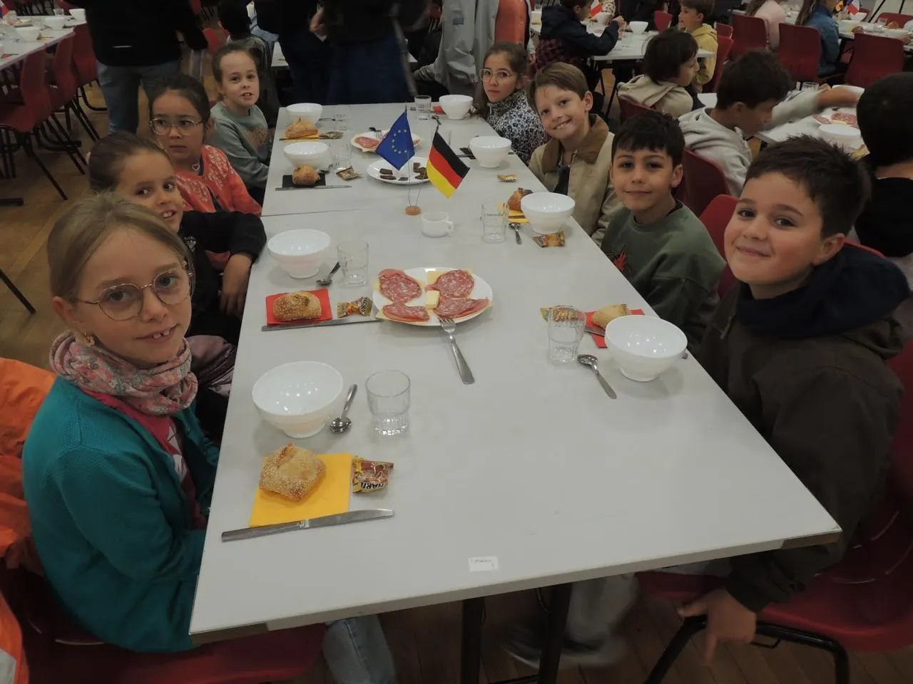 Salle Jacques Brel, le comité de jumelage a donc reçu jeudi 11 septembre 2025 les enfants des quatre écoles de la ville en classe de CM1 et CM2 autour d’un petit-déjeuner comme à Kamen. Au menu du jour : pain blanc et noir, beurre, confitures, charcuterie, fromage, chocolat et jus de fruits.
