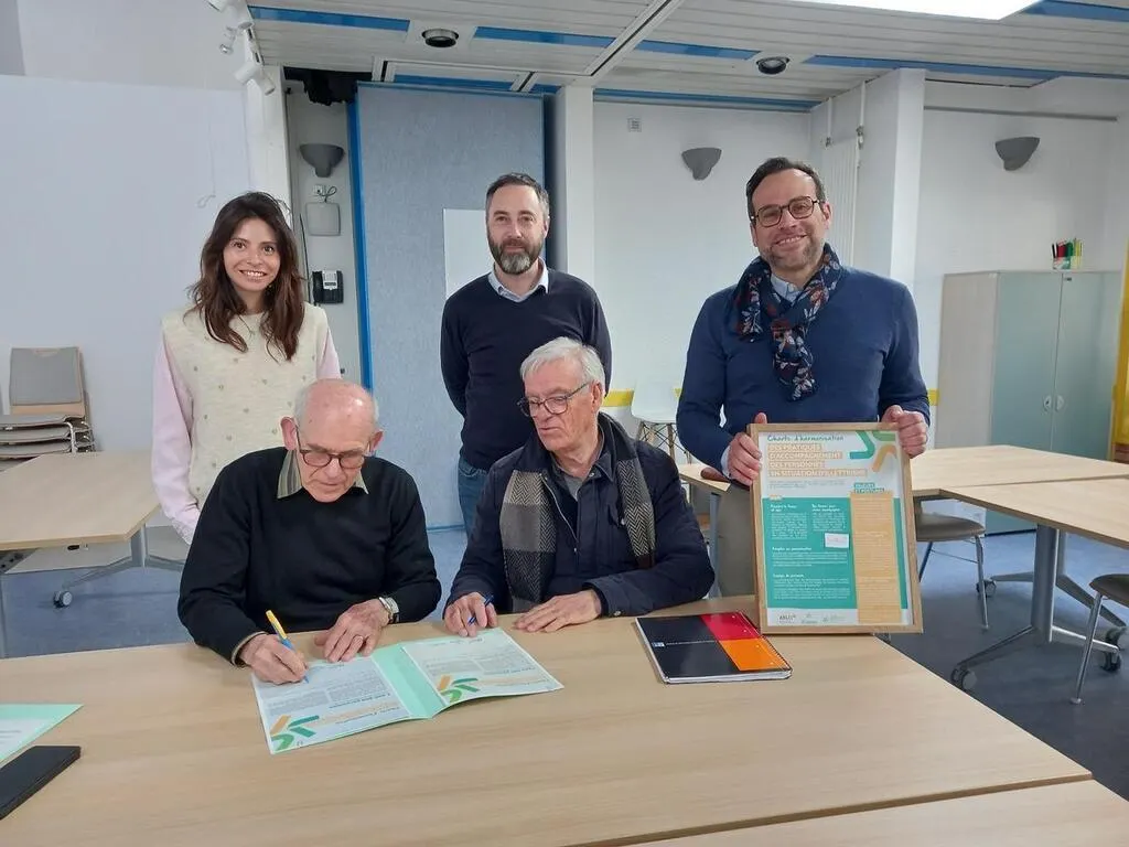La convention de partenariat a été signée le 2 avril 2025 au Village Pierre-Rabhi (VPR) par le président de l’Ifraess Henri Ménard et le maire, Dominique Bréjeon, en présence de Mallorie Bissirier, chargée de mission illettrisme, Nicolas Viau, directeur de l’Ifraess et Mickaël Crémont, directeur du VPR. © Ouest-France