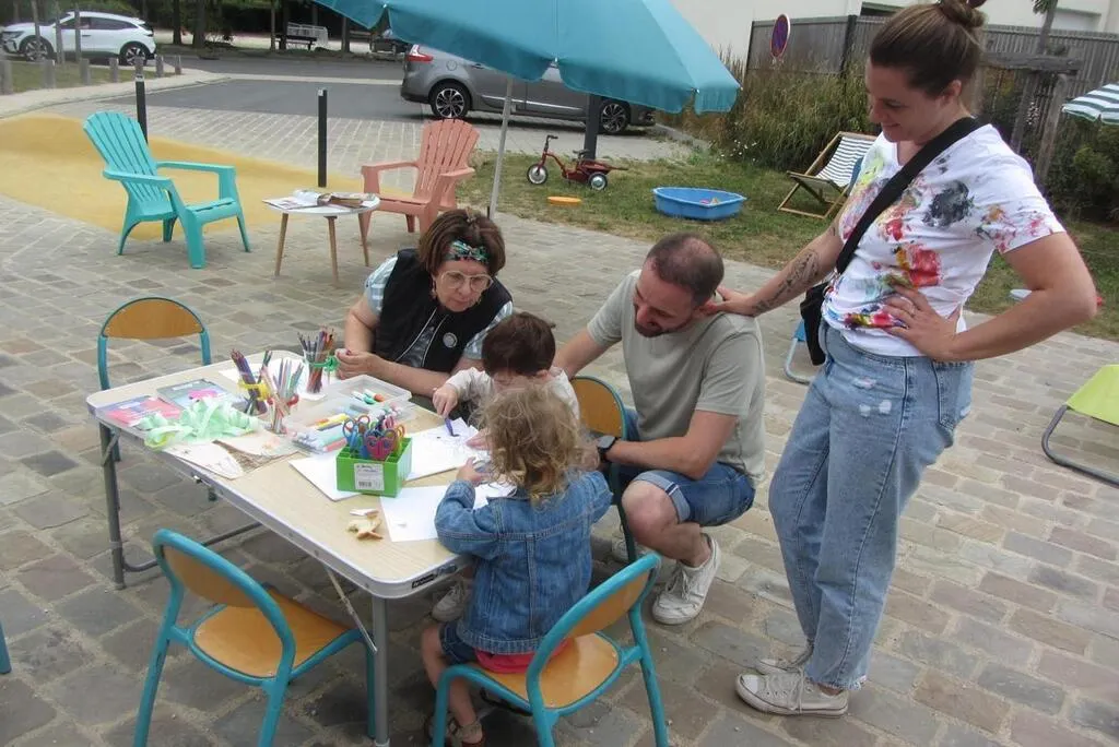 Un peu plus loin, il y a une dame s’est assise aussi sur une petite chaise et colorie avec application les papillons mis à sa disposition. Un garçonnet et une fillette se sont joints à cette dame. Tous trois colorient les papillons et rivalisent de créativité, associant les couleurs au gré de leur fantaisie.