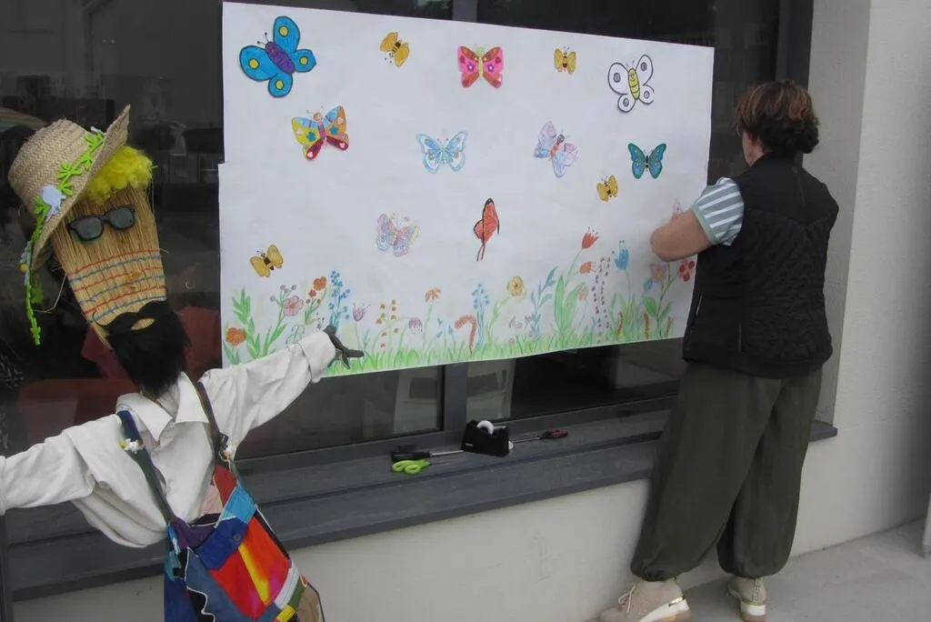 La prairie fleurie où volent les papillons coloriés par les enfants et la dame au bandeau ornera un mur de la bibliothèque. Ouest-France
