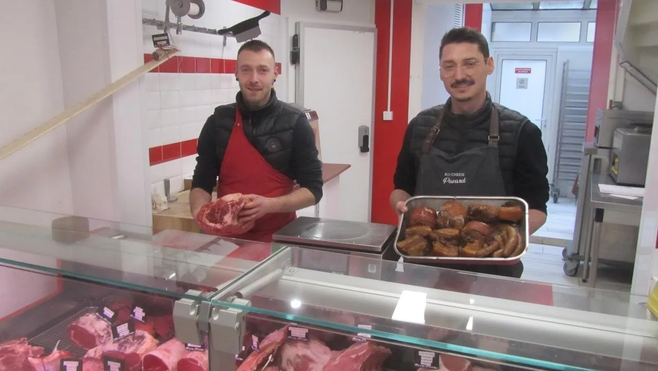 Dylan Leblanc (à gauche), ancien apprenti et employé de la boucherie-charcuterie-traiteur Vincent et Pavard, située 4, rue Lazare-Carnot, a repris en 2025 le fonds de commerce de la boucherie Pavard. Ici en magasin avec son employé Frédérick Savaris. © CO