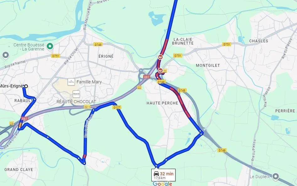La circulation est difficile ce lundi matin 25 novembre 2024, sur l’A87, après l’accident entre un poids-lourd et une voiture. Googgle map