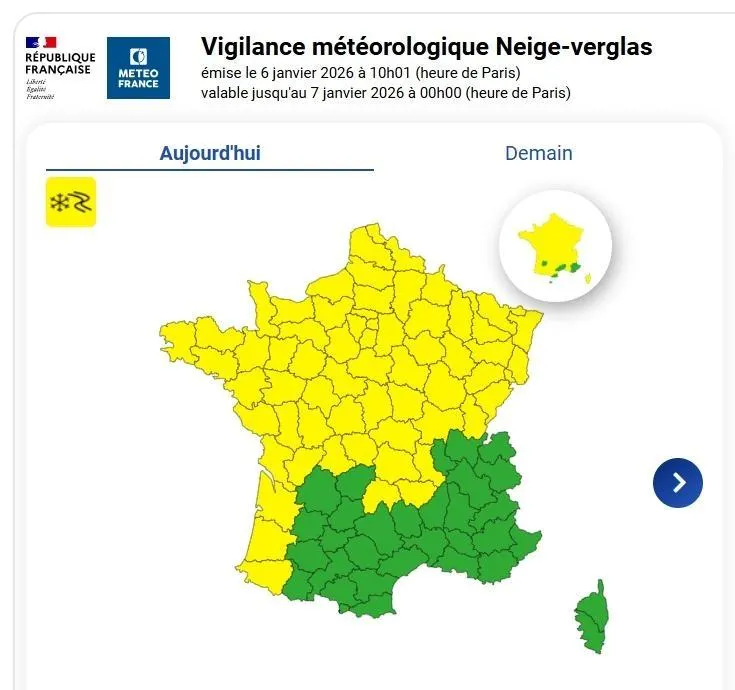 La nouvelle carte, publiée ce mardi 6 janvier à 10 h 30. Météo France
