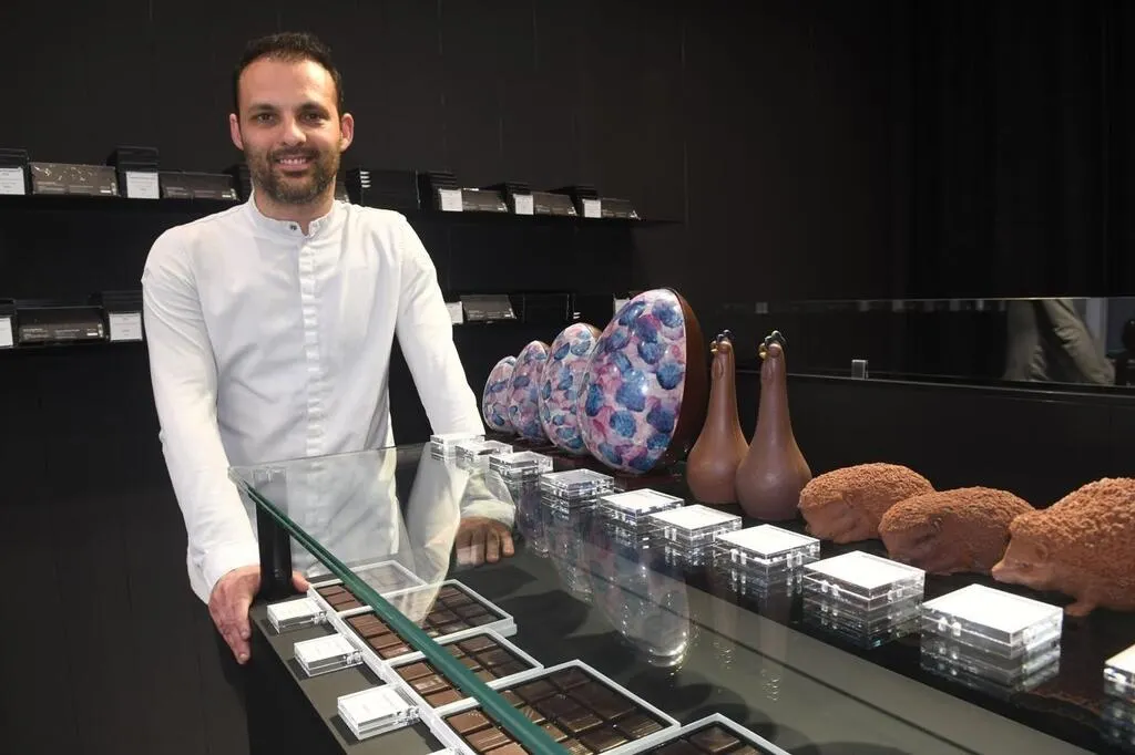 Damien Vétault accueille Pâques avec gourmandise dans la boutique 100 % chocolat qu’il a ouverte rue Saint-Aubin, à Angers, en complément de son magasin originel de la place du Lycée.