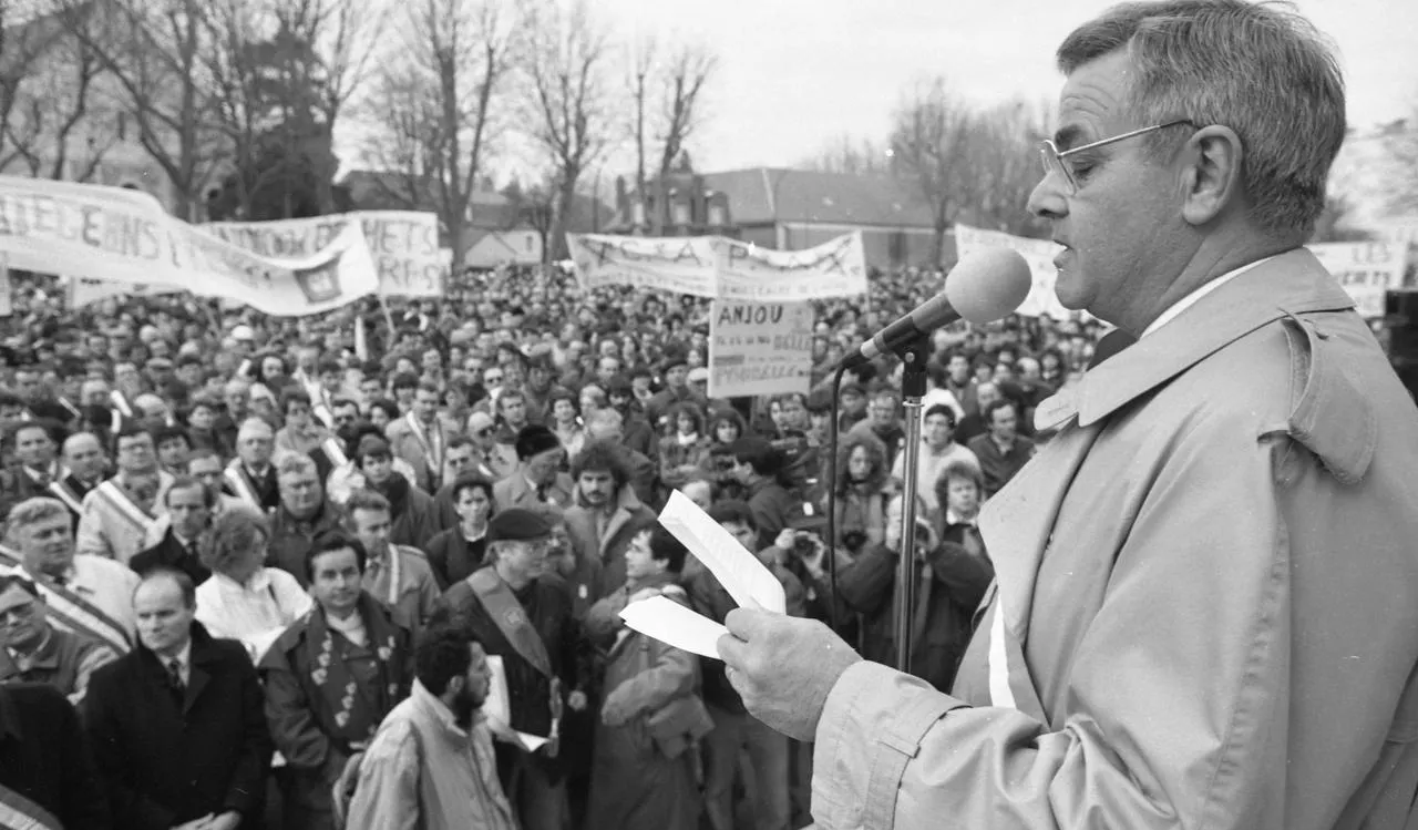 Le 20 janvier 1990, à Angers, Roland Bruneau, alors maire du Bourg-d’Iré, s’était exprimé devant 15 000 opposants au projet d’enfouissement des déchets nucléaires. Trois semaines plus tard, ils obtinrent gain de cause. © ARCHIVES GUY DANIEL / OUEST FRANCE