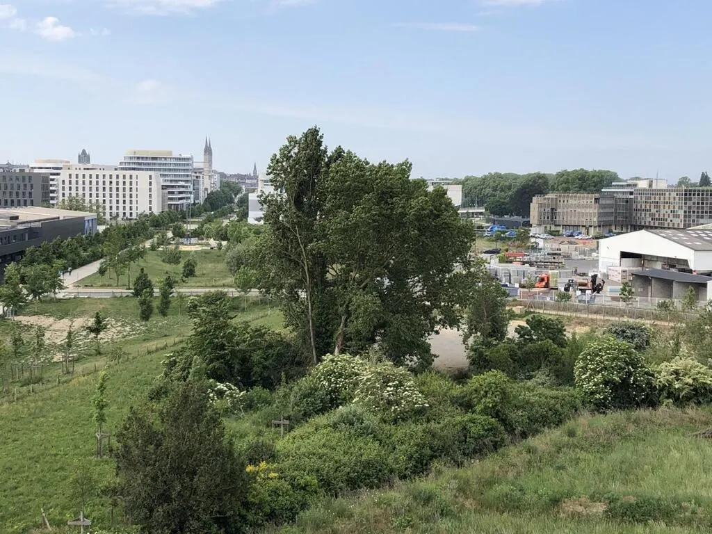 Angers, vendredi 9 mai 2025. D’autres aménagements sont à venir dans la ZAC Quai Saint-Serge. Au fond à droite, la communauté urbaine a racheté les bureaux d’Enedis. Ils seront conservés et rénovés. © CO