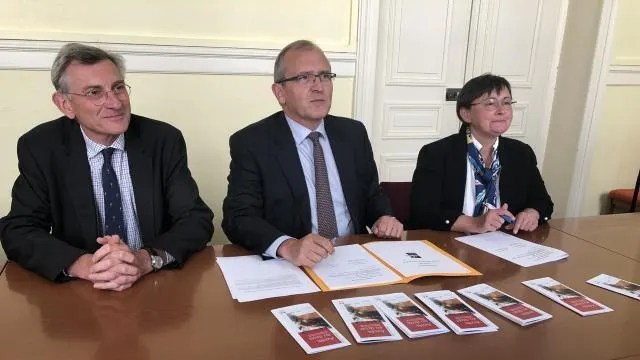 Yves Gambert, procureur de la République, et Xavier Pavageau, président du tribunal de grande instance d’Angers, respectivement vice-président et président du CDAD, et Emmanuelle Pineau, présidente du Centre Anjou Maine de médiation et d’arbitrage. © Ouest-France