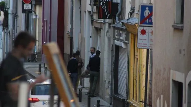 Volet roulant fermé. Lumière visible au travers de la vitre dépolie contre laquelle des personnes sont adossées. Au 31 de la rue du Cornet, sous un balcon où s’affiche un panneau « à vendre »