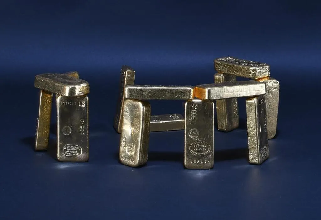 Quatorze lingots, assemblés ici comme un hommage à Stonehenge, en Angleterre, seront en vente le 10 mars à Angers. © Maison de ventes Deloys