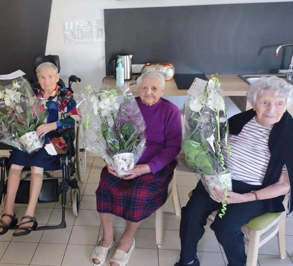 Elles n’ont pas pu participer au repas du CCAS, mais ont reçu des fleurs pour leur centenaire révolu ou à venir. De gauche à droite : Marie-Thérèse Roux et Simone Babin, déjà centenaires, et Odette Vêtu, qui le sera en novembre. © CO
