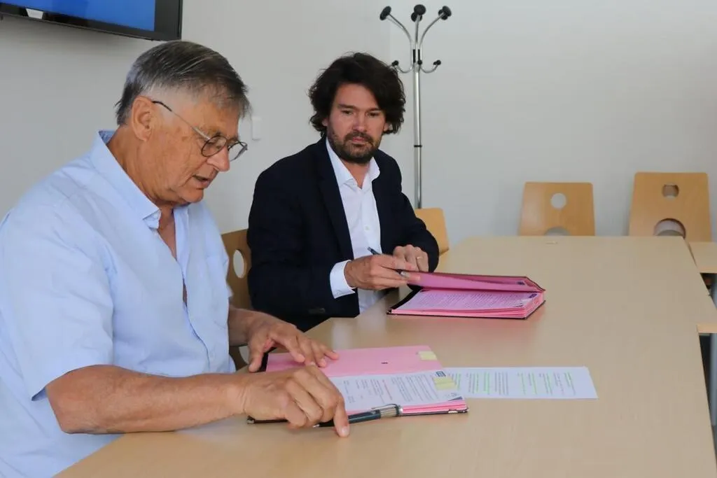 Gilles Grimaud (à gauche), président d’Anjou Bleu communauté, et Matthieu Billiard, président de la CCI de Maine-et-Loire, ont paraphé deux conventions mardi 13 juin. © Ouest-France