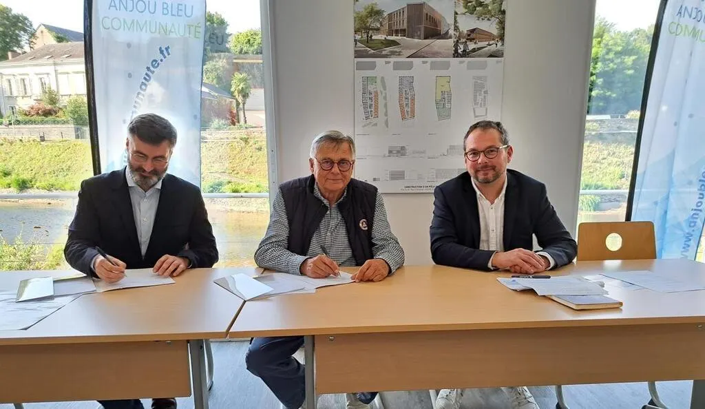 Thomas Hanss, coordinateur des opérations Bimby-Bunti à Villes vivantes ; Gilles Grimaud, président d’Anjou Bleu communauté, et Jean-Noël Gaultier, vice-président chargé de l’habitat, ont signé la convention Bimby-Bunti. © Ouest-France