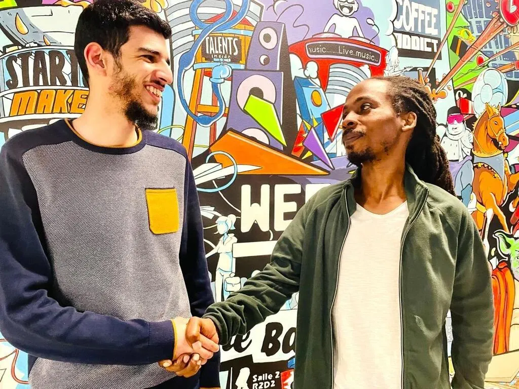 Mohamed Rhoulben, à gauche, de l’association Osons entreprendre, et Jaahly, porteur de projet, dans les locaux de WeForge, à Angers, qui héberge les ateliers de l’association. © Ouest-France