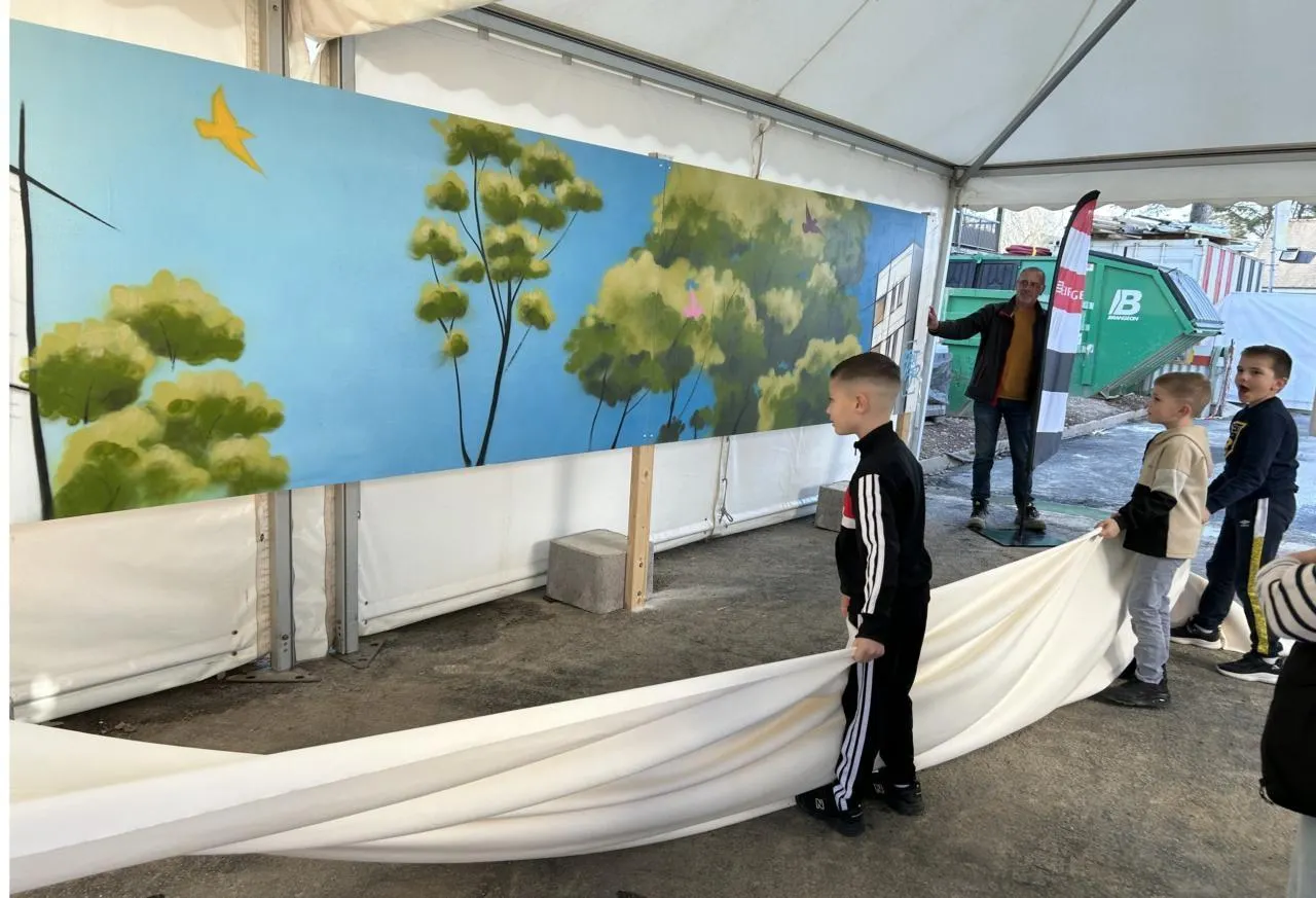 Cette fresque disposée sur les panneaux qui entourent les travaux sera ensuite intégrée dans un lieu destiné aux jeunes dans l’enceinte du complexe.