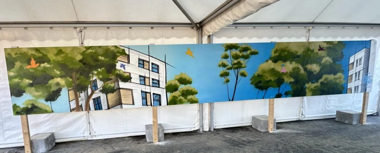 Les équipes d’Eiffage Construction Maine-et-Loire et les jeunes du quartier du Général-de-Gaulle ont mené ensemble un projet artistique : la création d’une fresque sur le chantier de rénovation des logements du bailleur Podeliha en centre-ville. La fresque a été inaugurée mercredi 4 mars en présence de Caroline Houssin-Salvetat, maire, de Yannick Demeautis, responsable territorial de Podeliha, et de Cyril Labenne, directeur d’Eiffage Construction Maine-et-Loire. © CO
