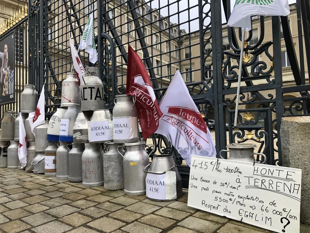 Les producteurs de lait de Maine-et-Loire ont formé un mur de bidons devant la préfecture de Maine-et-Loire. © CO