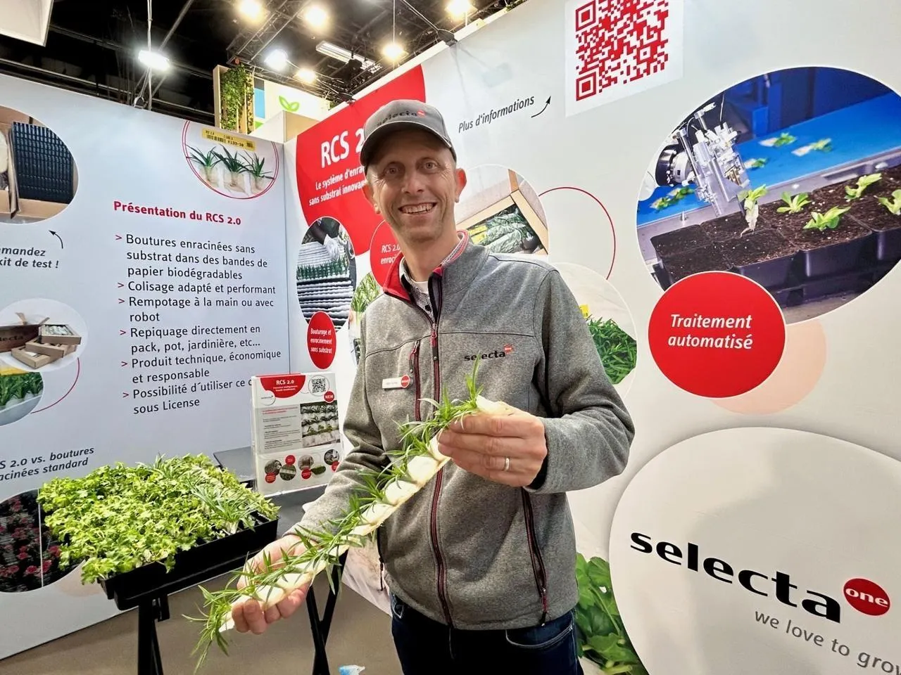 Angers, parc-expo, le 13 janvier 2026. Cédric Courtial présentant le système d’enracinement primé par le Sival. © CO