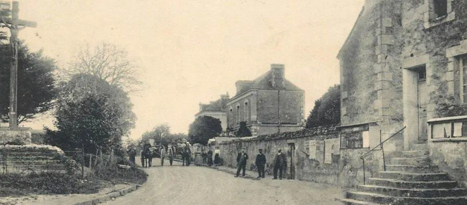 Le bourg d’Échemiré vers 1950 (à droite l’actuelle cantine scolaire, autrefois auberge et mairie). © CO