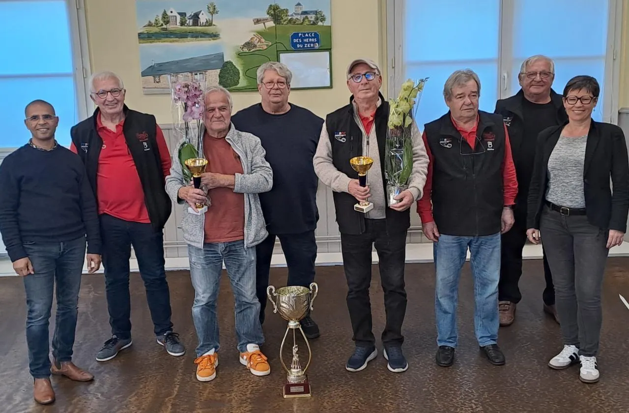 De gauche à droite : Xavier Anaïs, adjoint à la vie associatif sport et loisirs ; Loïc Landeau, responsable de la commission des jeux ; André Lemanceau ; Jean-Luc Billerault ; Paul Taveau, le gagnant du challenge ; Hubert Lafuenté, président du Beau-Coup ; Roger Boivin ; et Hélène Bernugat, adjointe déléguée à la culture, communication et dialogue citoyen de Beaucouzé. © Ouest-France