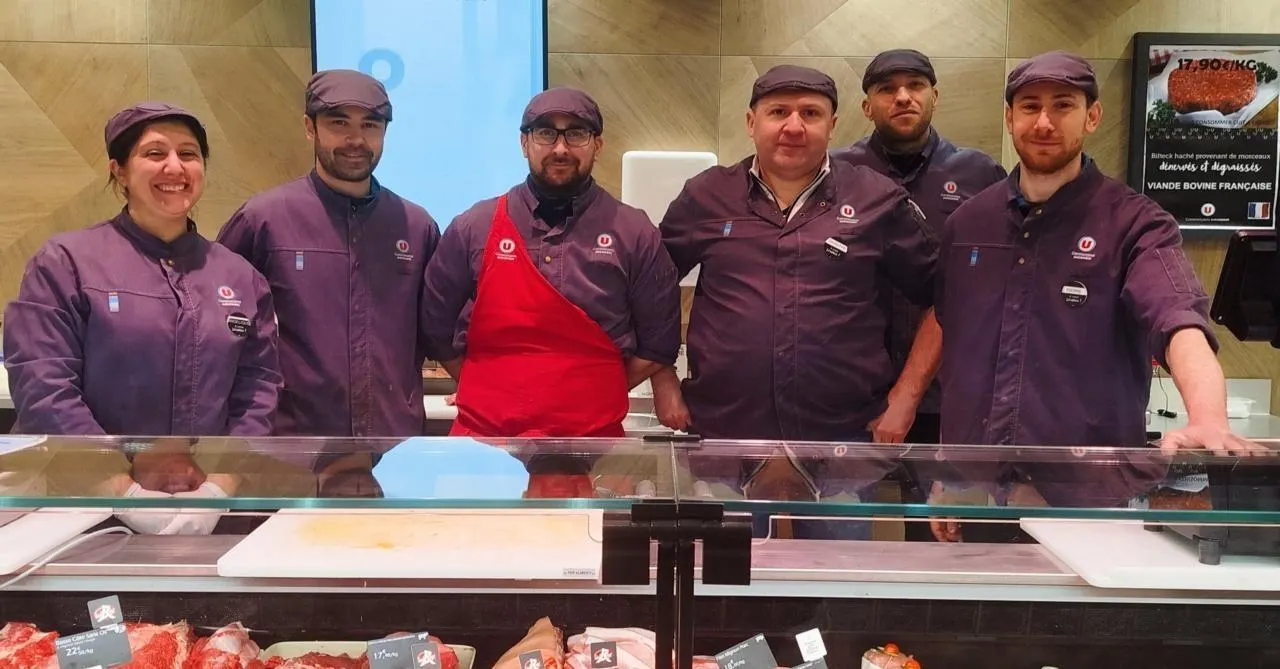 Une partie de l’équipe de bouchers du Super U de Beaucouzé avec le responsable, Pierre Chartier (à droite). © CO