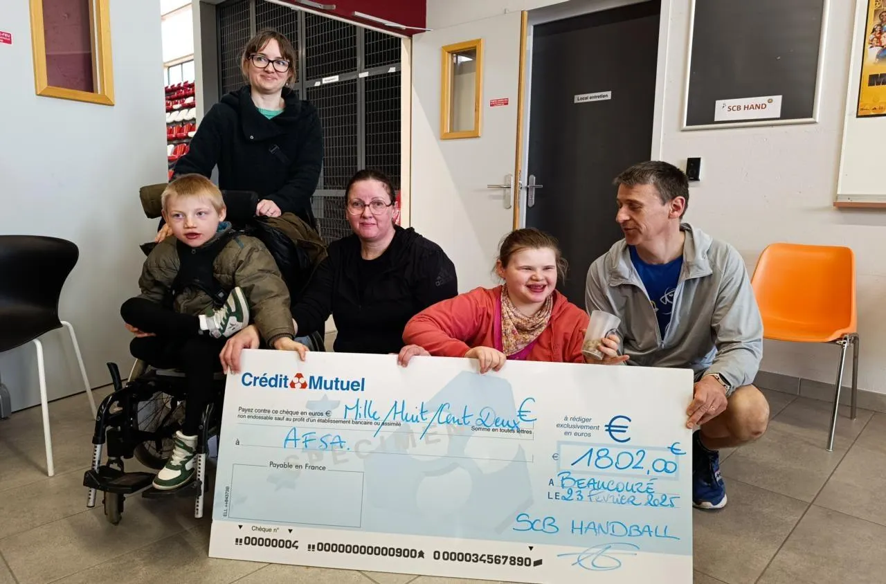 Le chèque remis à l’AFSA par Beaucouzé handball lors d’une précédente édition. © CO