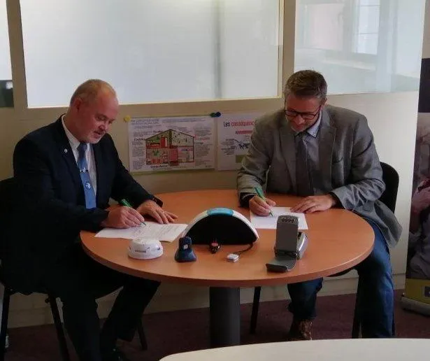 Signature du partenariat entre Thierry Lesain, président UNPRG 49 et Jean-Claude Dudouit, directeur de Présence Verte 49.