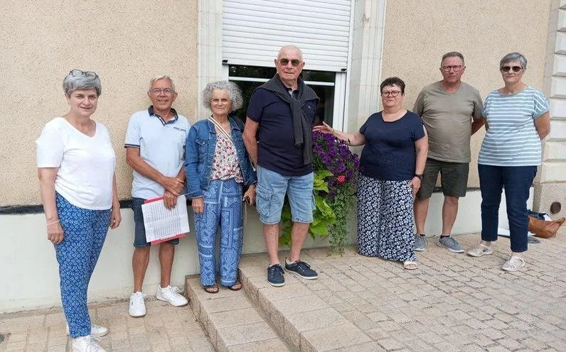 De gauche à droite : Catherine Chereau, Arnold Bouget, Lydie Gentilhomme, Guy Deschamps, Béatrix Vételé, Alain Colas et Cécile Gillard, prêts pour aller visiter les maisons inscrites au concours des maisons fleuries. © CO