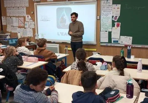 Après avoir informé les enfants sur les inégalités d’accès à l’eau dans le monde, Hugo Veidie leur a montré le cycle de l’eau dans la nature. Un petit film d’animation a ensuite permis d’expliquer le chemin suivi par l’eau – du site de puisage jusqu’au robinet, en passant par l’usine de potabilisation – puis le chemin qu’empruntent les eaux usées avant le retour dans la nature.