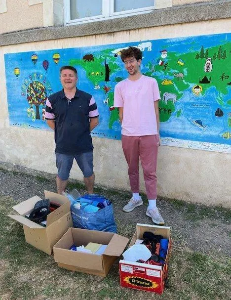 Hugues Boivin (à gauche) et Tom Chaineau derrière les fournitures collectées. © École Saint-Louis