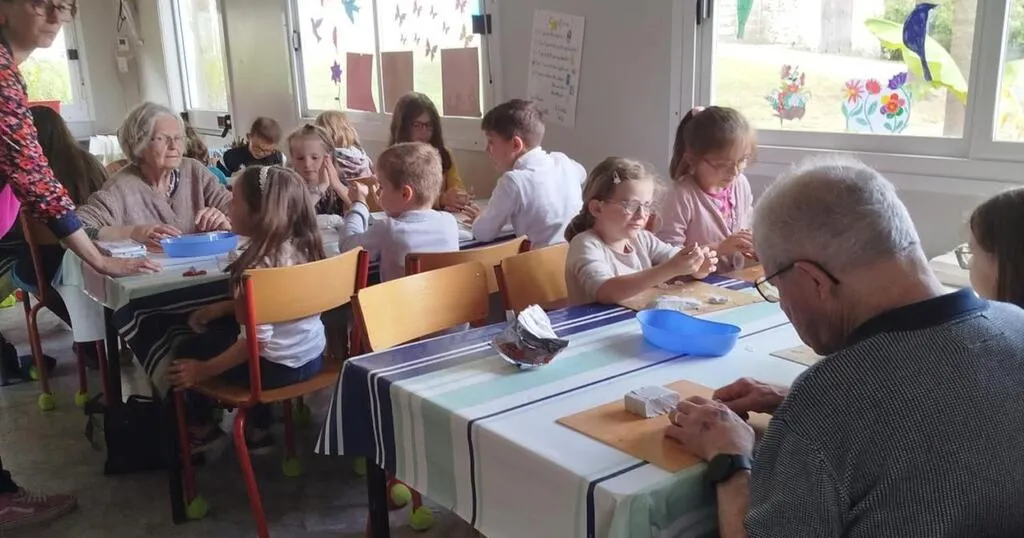 Bécon-les-Granits. Écoliers et seniors font du modelage ensemble... |