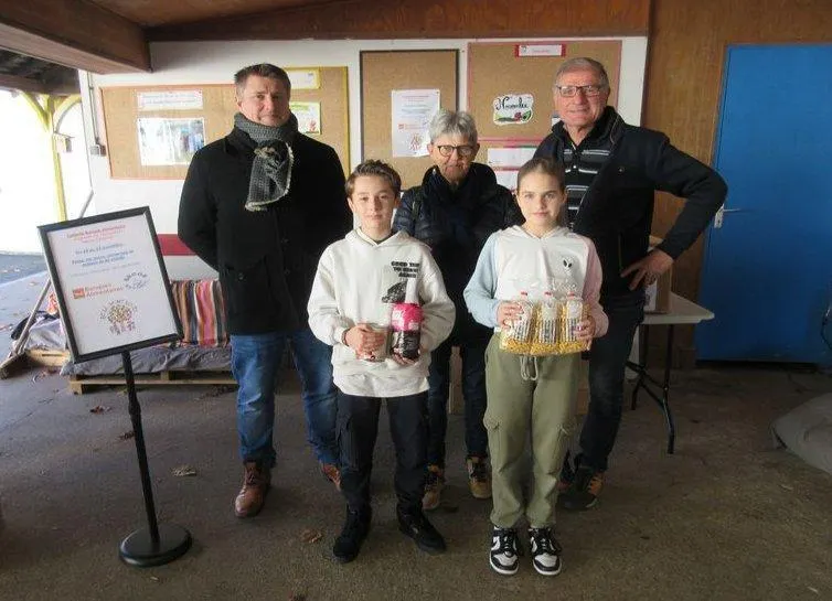 Au second rang, Hugues Boivin, directeur de l’école Saint-Louis, Jacqueline Onillon, présidente de Bécon solidarité, et Philippe Rolland, membre de l’association, et au premier plan, Achille et Line, deux élèves de CM2, lors de la remise des denrées alimentaires. © Ouest-France