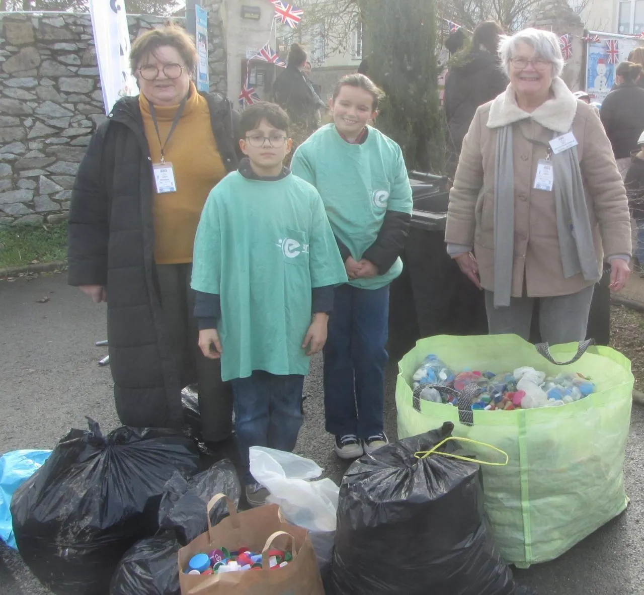 Deux des quatre enfants écodélégués de l’école posent avec les responsables des Bouchons de l’espoir 49 devant la collecte. © Ouest-France