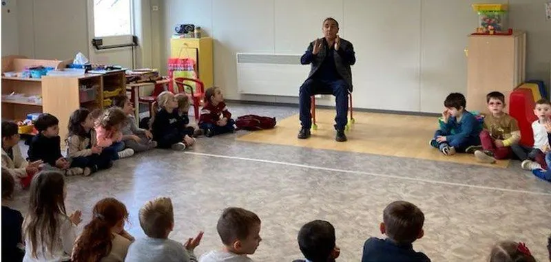 Estevan Ellul, dumiste (car titulaire du Dumi, Diplôme universitaire de musicien intervenant), intervient à l’école Saint-Louis toute l’année, afin d’apprendre des chants, des rythmes et de présenter des instruments aux élèves de Grande section, CP, CE1 et CE2. Ce projet en milieu scolaire est proposé par la Communauté de communes des Vallées du Haut-Anjou et organisé par l’école de musique de l’Anjou Bleu. © CO