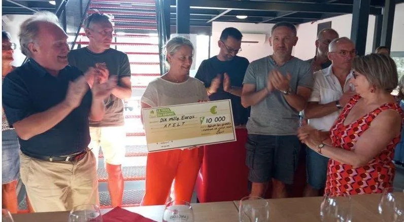 Vendredi soir, Magalie Girardeau (au centre), présidente d’Élosia, aremis un chèque de 10 000 € à Vincent Charbonnier (à gauche), président de Soleil Afelt, et à Maryse Tudoux (à droite), ex-présidente de l’Afelt, en charge maintenant de l’administratif. © CO