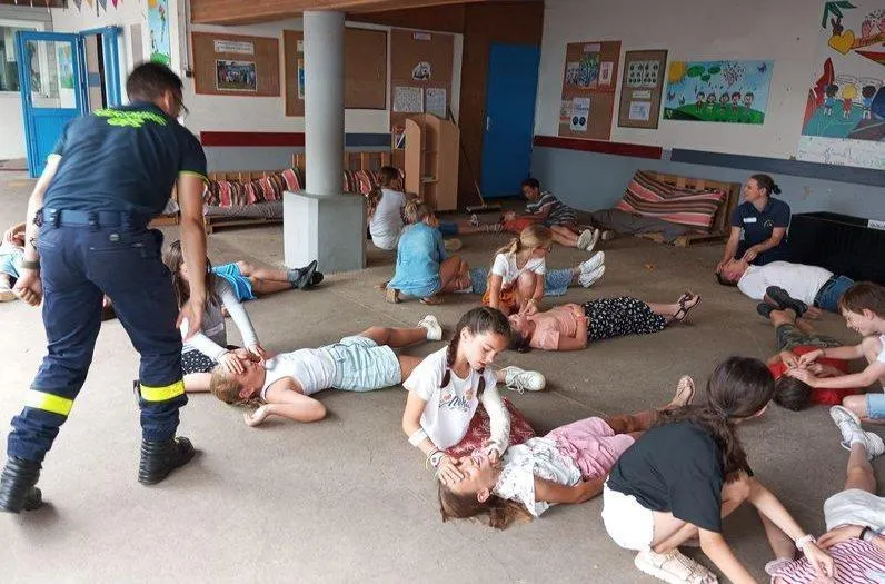 Sous la direction de Charlotte Brochard (au fond) et Léo Cady, les formateurs du Centre français de secourisme, les élèves de CM2 de l’école Saint-Louis ont appris les gestes qui sauvent. © CO