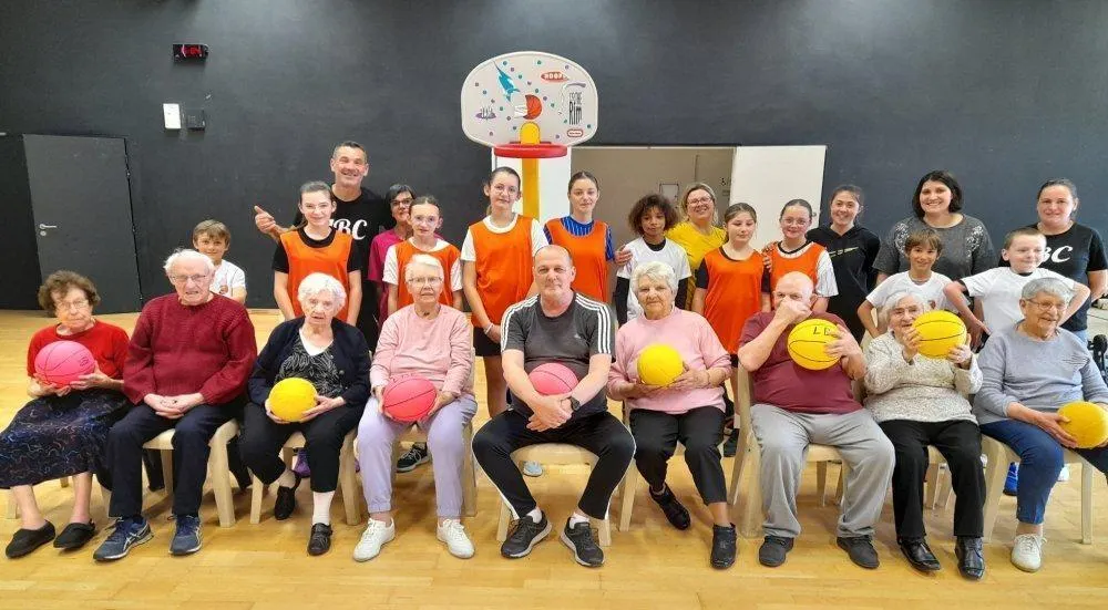 Les résidents de l’Ehpad, ici en compagnie des jeunes basketteurs du Layon basket-club de Thouarcé et des accompagnateurs. © CO