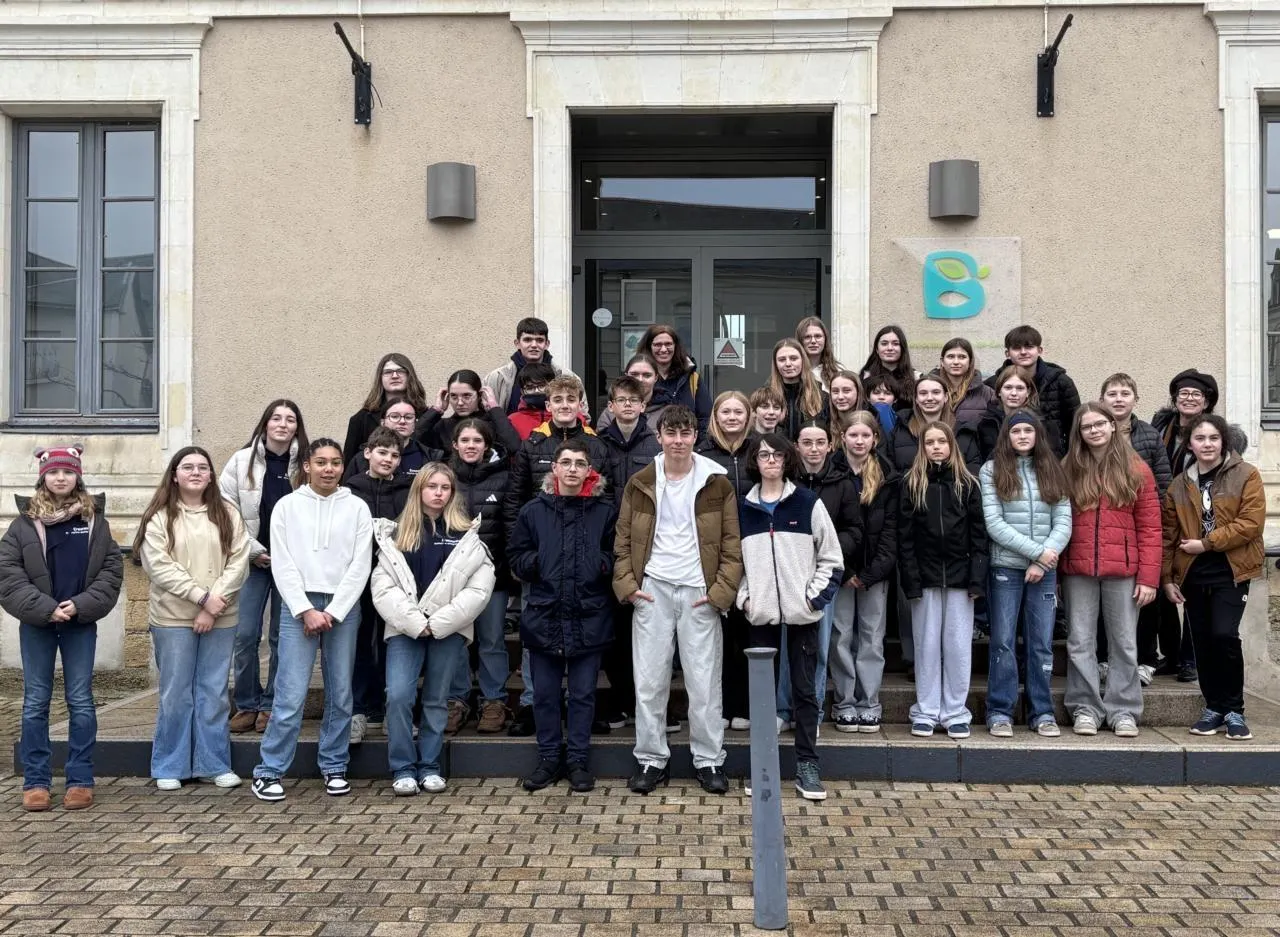 Les élèves devant le parvis de la mairie de Thouarcé. © CO