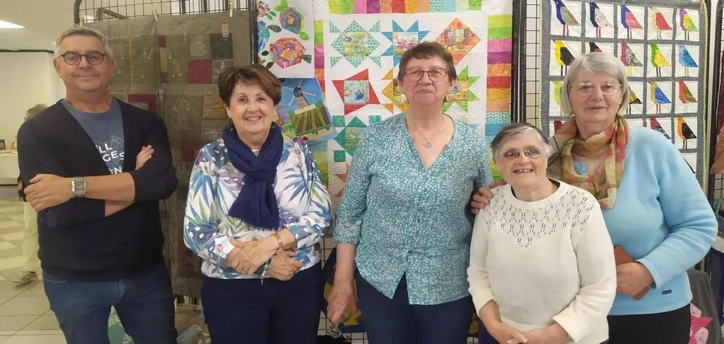 À gauche, Dominique Normandin, maire ; au centre, Françoise Rousseau, déléguée de France Patchwork 49, entourés d’adhérentes de Créa’loisirs. © CO