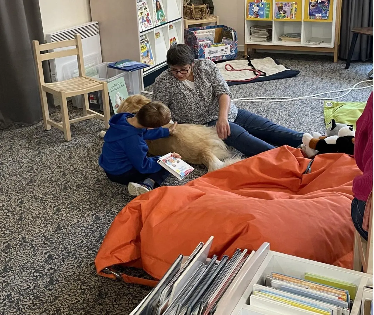 Cindy Mildange, médiatrice, et Nelson, le chien médiateur, lors de la séance de lecture avec les enfants. © CO