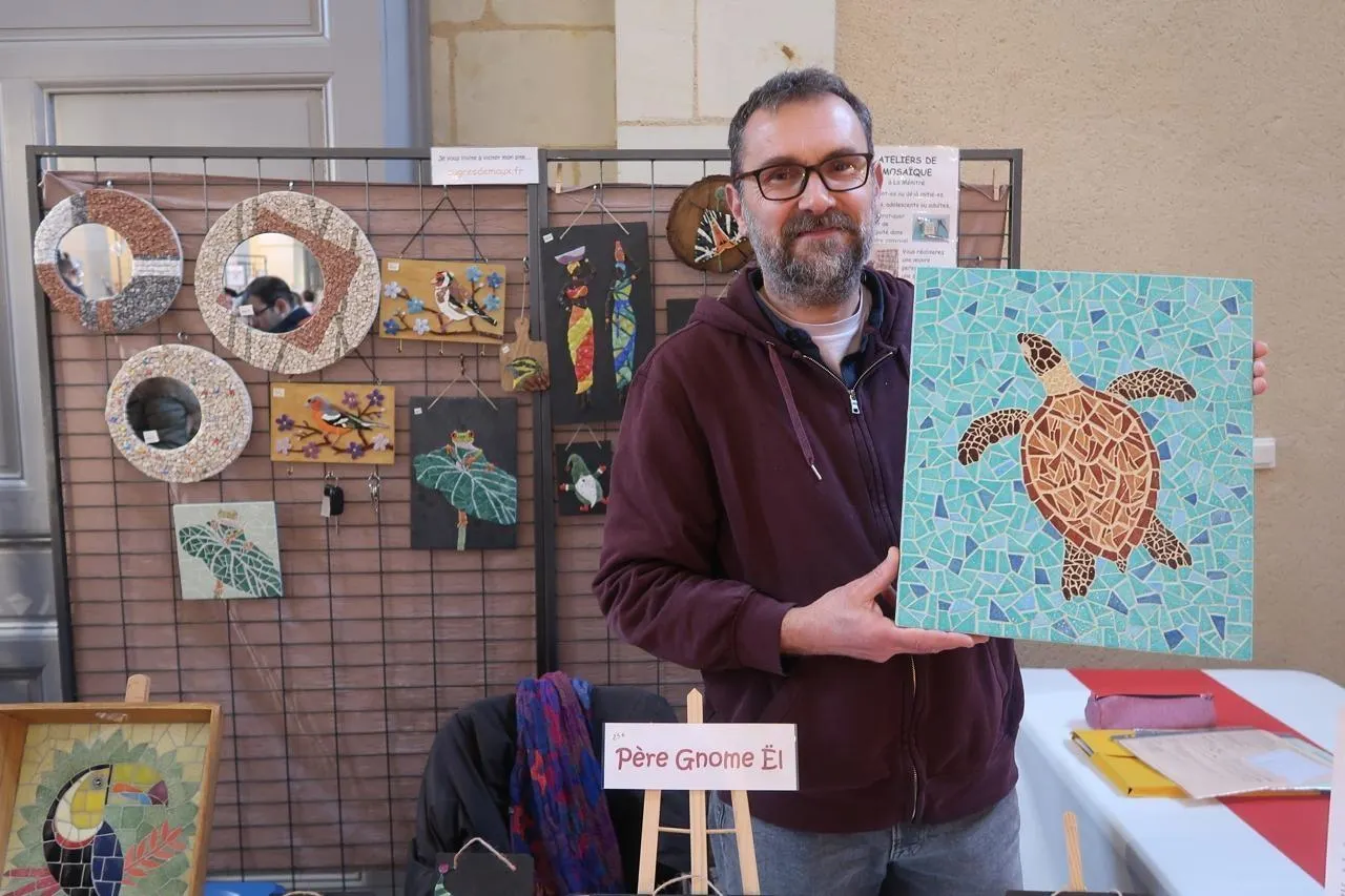 Beaufort, le 14 décembre 2025. Le Mazéiais Christophe Froidefond s’est reconverti en mosaïste d’art. Son thème de prédilection : les animaux. © CO - Agathe LE NUEFF