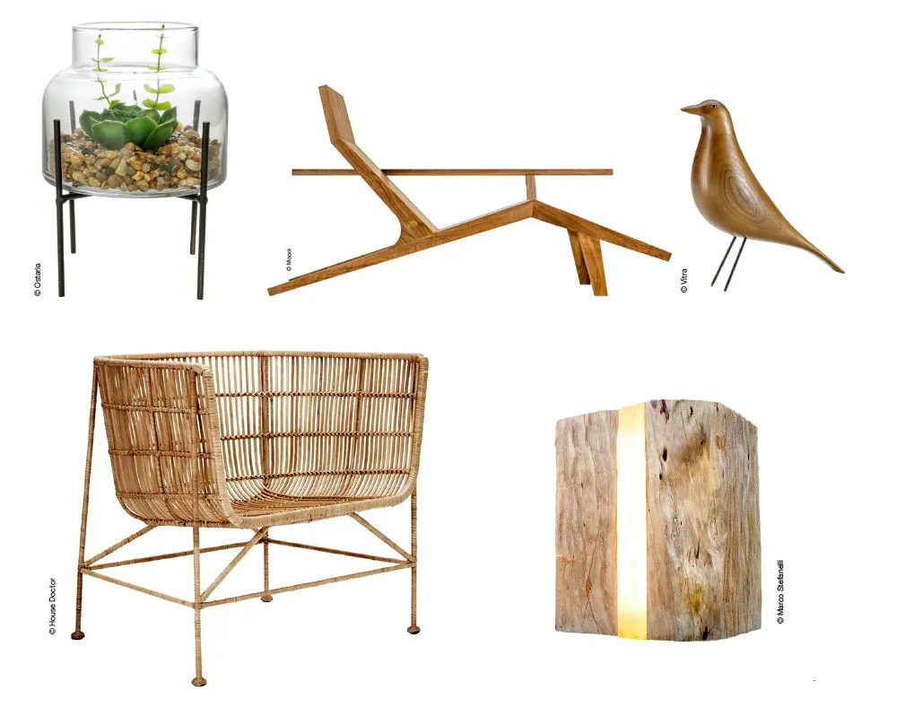 Cette tendance régénérante qui sollicite tous nos sens renvoie aussi à une forme d’agencement organique, naturellement imparfait. Le bois est brut, les végétaux verticaux (plantes suspendues ou en pot), les couleurs neutres (lin, beige, gris terreux, terracotta), les matériaux minéraux (basalte, grès, marbre). Des imprimés floraux, une vasque en bois pétrifié, un lit cabane, un meuble en bois flotté, un mur d’accent vert d’eau, du linge de lit en fibres naturelles plantent les premiers éléments de décor pour remettre la nature dans nos espaces.